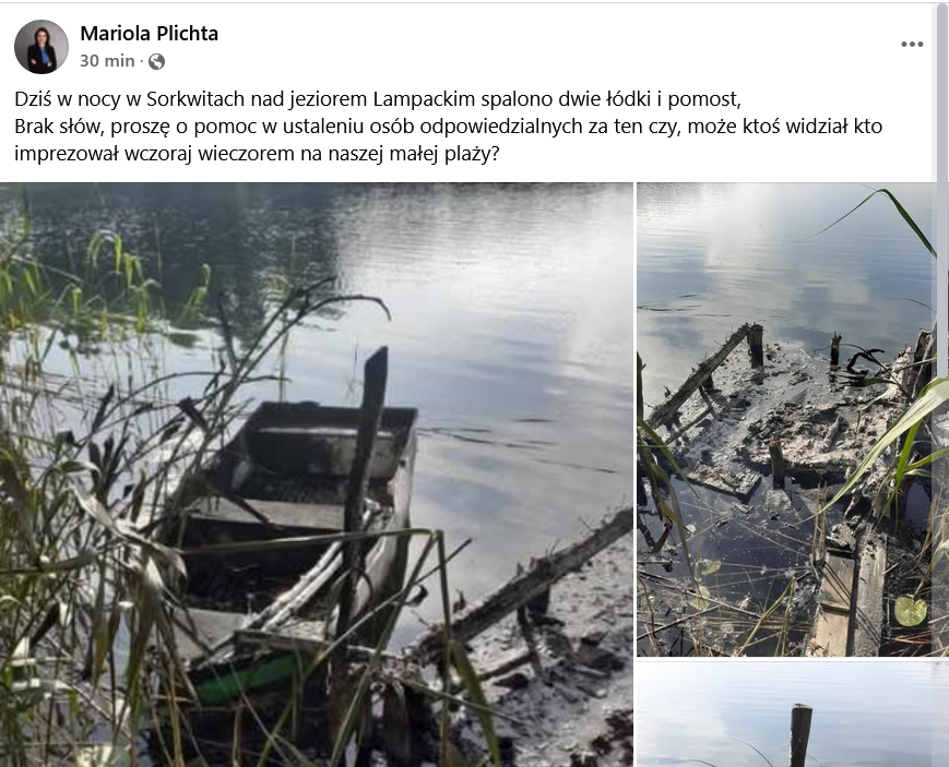 W nocy z 5 na 6 lipca doszło do aktu wandalizmu na terenie gminy Sorkwity. Nad jeziorem Lampackim, przy tzw. „małej plaży” w Sorkwitach, spłonęły dwie łódki oraz drewniany pomost.