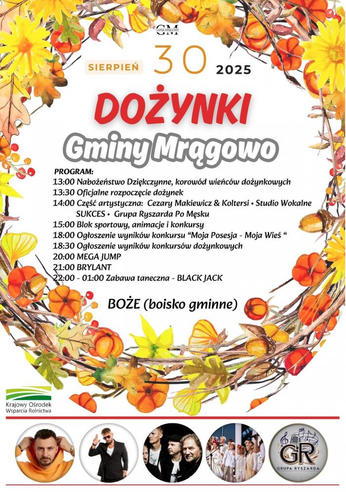 W sobotę, 30 sierpnia, na boisku gminnym w Bożem odbędą się tegoroczne Dożynki Gminy Mrągowo. To jedno z najważniejszych wydarzeń w kalendarzu gminy, które co roku gromadzi setki mieszkańców, rolników, turystów i sympatyków regionu.