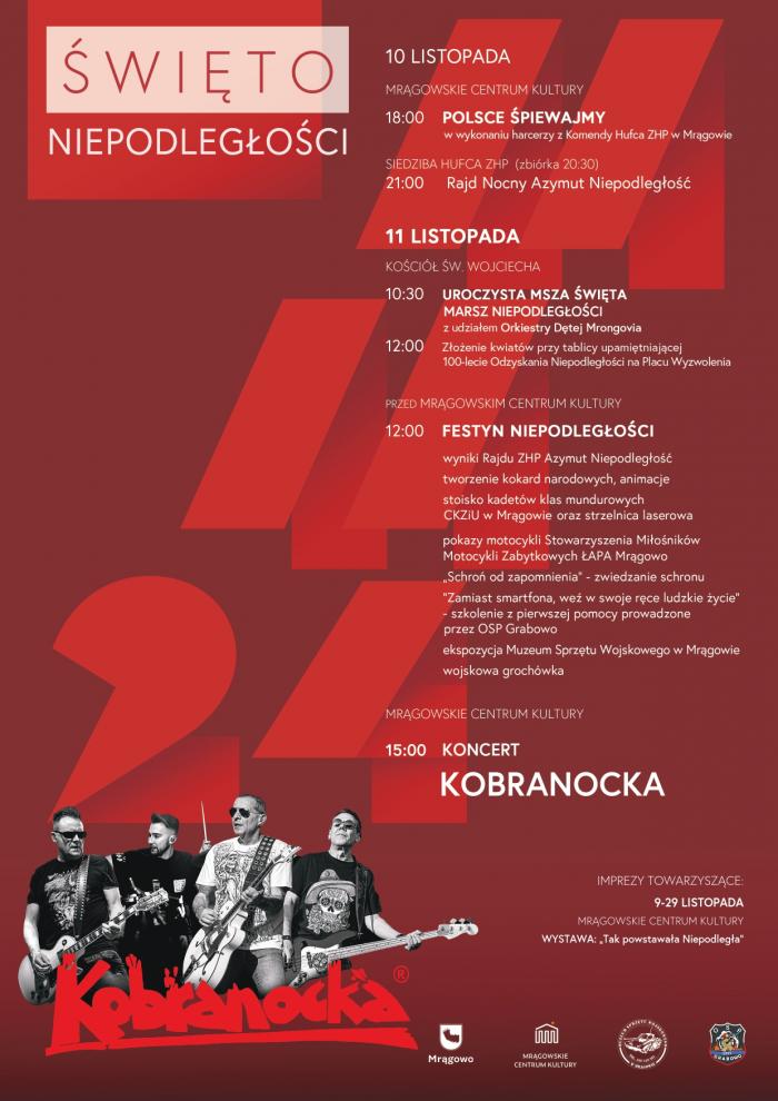 Po części oficjalnej na uczestników czeka Piknik Niepodległościowy, pełen atrakcji dla całych rodzin. Punktem kulminacyjnym wieczoru będzie koncert legendarnej grupy Kobranocka w Mrągowskim Centrum Kultury. Zespół, znany m.in. z przeboju „Kocham Cię jak Irlandię”, dostarczy niezapomnianych emocji, łącząc punk rock z unikalnym stylem pełnym humoru.