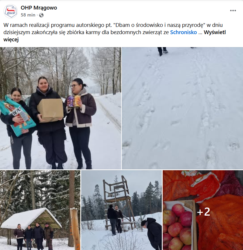 Działania nie zakończyły się na wsparciu schroniska. Przy współpracy z Wojskowego Koła Łowieckiego Sokół w Mrągowie młodzież wzięła udział w spacerze po lesie z myśliwym, który opowiedział o znaczeniu dokarmiania zwierzyny w okresie zimowym. Przy okazji na leśnych paśnikach pozostały owoce i warzywa, przeznaczone dla zwierząt na ten trudny, zimowy czas.