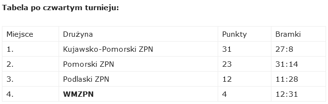 Nasza drużyna niestety nie wypadła najlepiej, przegrywając z koleżankami z okręgów pomorskiego i kujawsko-pomorskiego, a zwyciężając jedynie z rówieśniczkami z Podlasia. Po czterech turniejach piłkarki z Warmii i Mazur zajmują ostatnie miejsce w grupie. Na czele żeński team województwa kujawsko-pomorskiego.