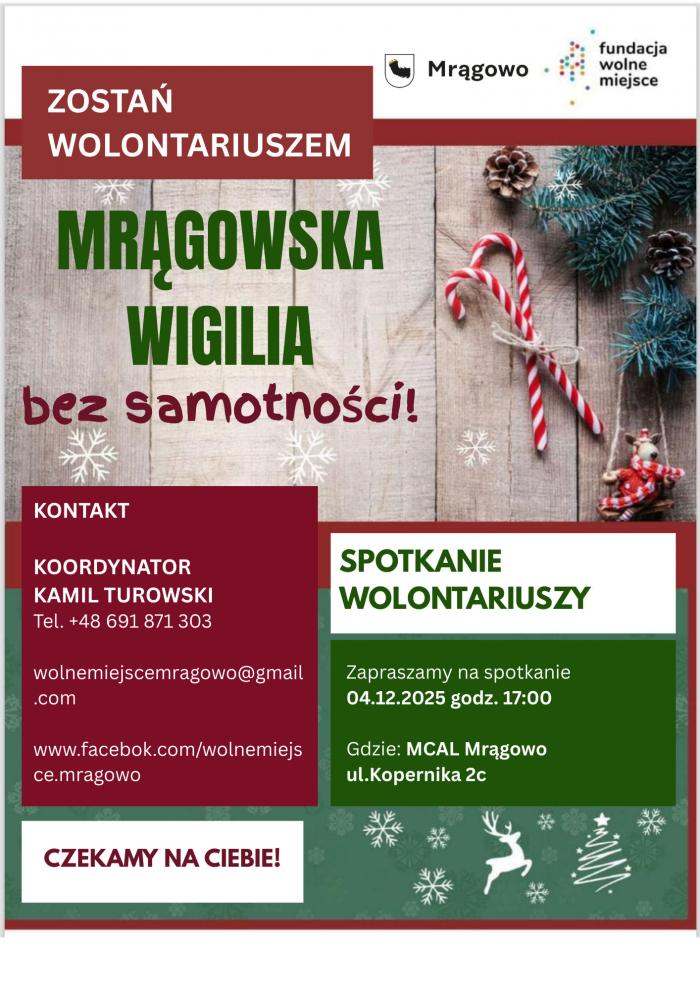 W mediach społecznościowych działa fanpage „Wolne Miejsce Mrągowo”, gdzie publikowane są kolejne informacje oraz terminy spotkań. Wszystko po to, by 24 grudnia nikt nie musiał spędzać świąt w samotności, a wspólny stół stał się symbolem bliskości i otwartości mieszkańców Mrągowa.
