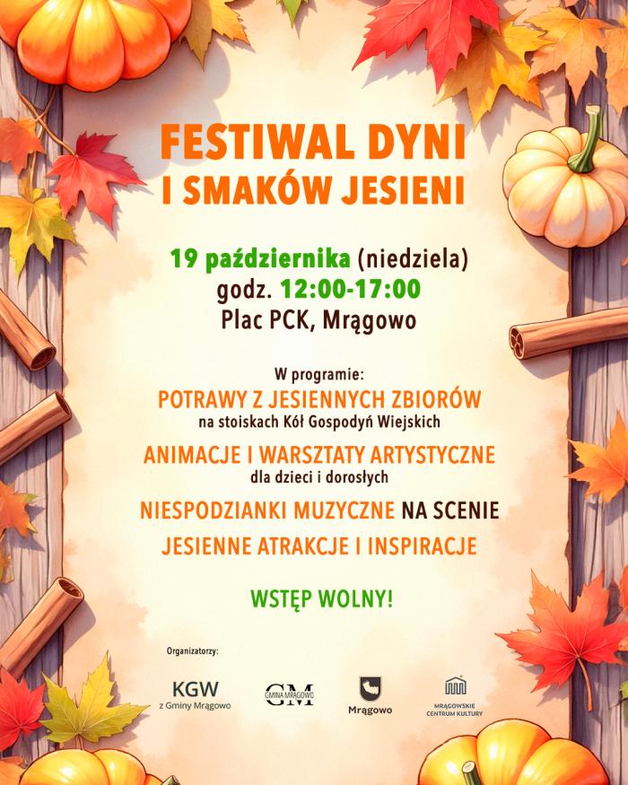 Organizatorzy – Koła Gospodyń Wiejskich z Gminy Mrągowo, Gmina Mrągowo, Miasto Mrągowo oraz Mrągowskie Centrum Kultury – zapraszają wszystkich, którzy chcą spędzić ten jesienny dzień w gronie rodziny i przyjaciół.