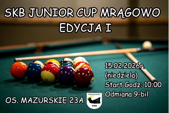 Klub Bilardowy Mrągowo zaprasza na I edycję turnieju SKB JUNIOR CUP. To nowa inicjatywa skierowana do młodych zawodników z regionu, która ma szansę stać się cyklicznym wydarzeniem w kalendarzu klubu.