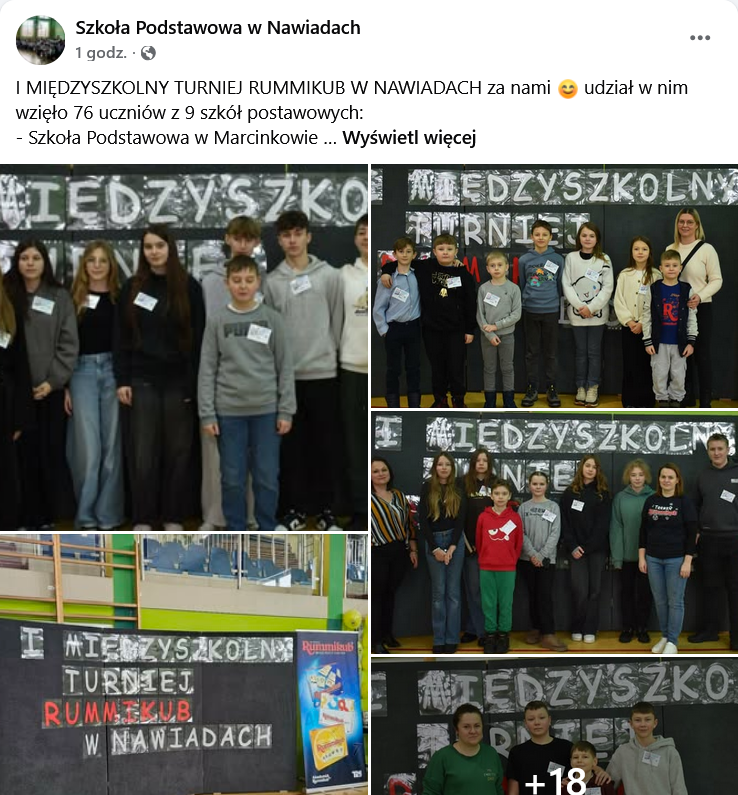Międzyszkolny Turniej Rummikub w Nawiadach zgromadził 76 uczniów z dziewięciu szkół podstawowych, w tym z Mrągowa, Piecek, Marcinkowa, Ukty, Szestna i Warpun. Po rozegraniu dziewięciu pełnych emocji partii zwycięzcami indywidualnymi zostali: Agnieszka Skrajna (I miejsce), Gabriela Skrajna (II miejsce), Jan Łoziński (III miejsce) oraz Orest Pudliński (IV miejsce). Specjalne wyróżnienia trafiły do Oliwiera Sobiecha – najmłodszego uczestnika – oraz Juliana Florka, zdobywcy tytułu Minus Master.