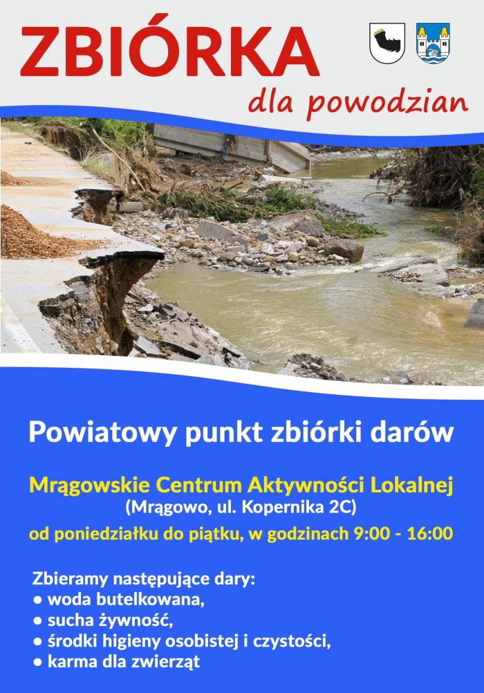 Mrągowianie oraz mieszkańcy gmin powiatu mrągowskiego wielokrotnie udowadniali, że potrafią wspierać potrzebujących w trudnych chwilach. Liczymy, że i tym razem okażą swoją solidarność. Miasto, wspólnie z samorządem Powiatu Mrągowskiego oraz gminami Mikołajki, Mrągowo, Piecki i Sorkwity, uruchomiło Powiatowy Punkt Zbiórki Darów dla Powodzian.
