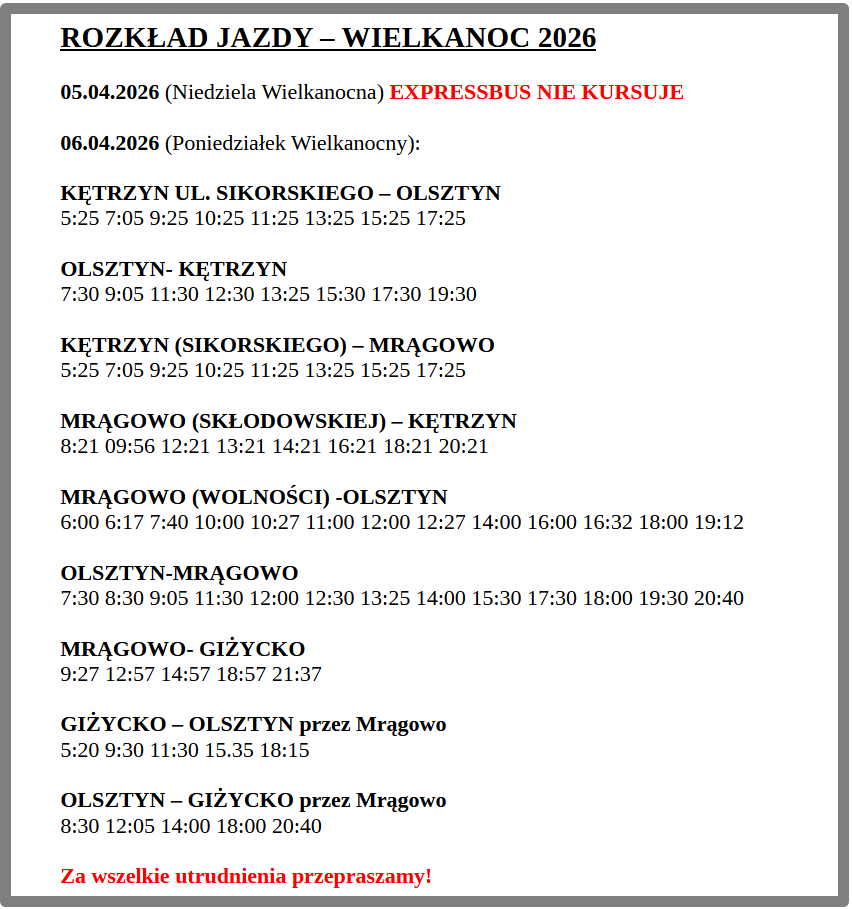 Podróżujący komunikacją publiczną muszą być gotowi na wielkanocne zmiany i ograniczenia. W okresie świątecznym zmieni się rozkład jazdy autobusów ExpressBusa, obsługującego m.in. połączenia przez Mrągowo.