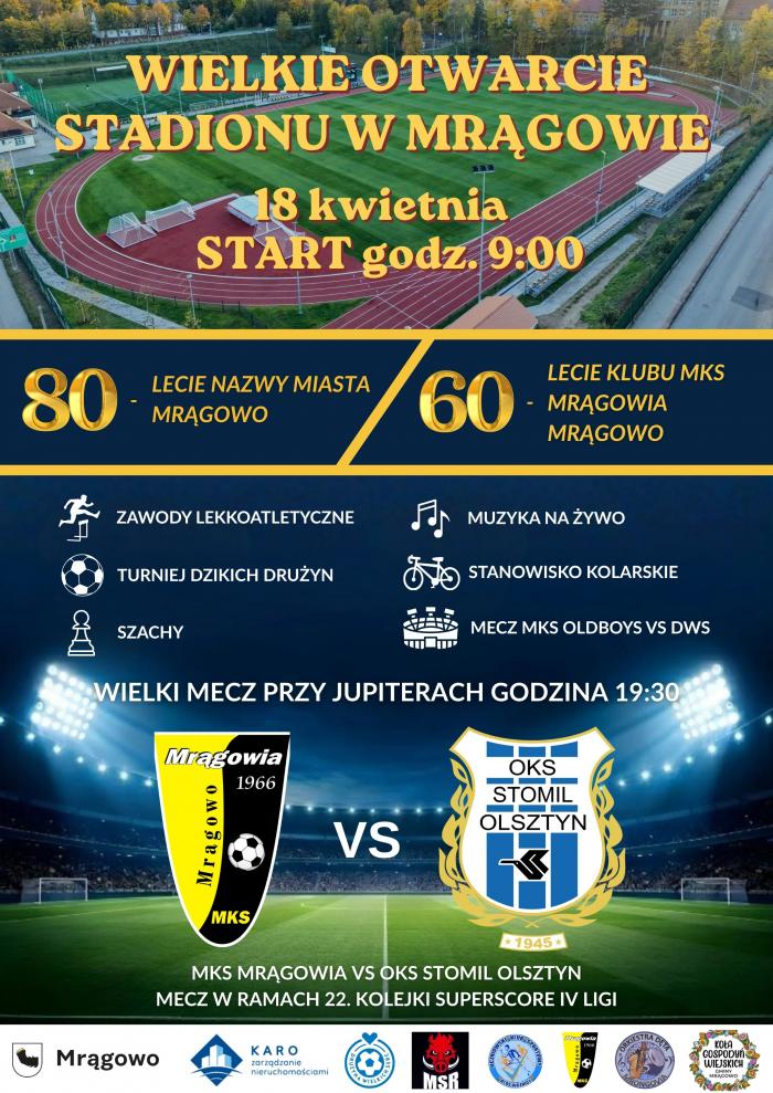 Kulminacja wydarzenia nastąpi wieczorem. O 19:30, przy stadionowych jupiterach, rozegrany zostanie mecz MKS Mrągowia Mrągowo – Stomil Olsztyn. Spotkanie z zespołem z Olsztyna będzie symbolicznym „chrztem bojowym” nowej murawy oraz okazją do wspólnego świętowania jubileuszu klubu z kibicami.