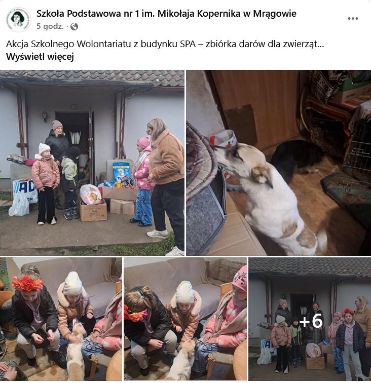 W Szkole Podstawowej nr 1 w Mrągowie zrealizowano kolejną inicjatywę w ramach Szkolnego Wolontariatu. Tym razem uczniowie, nauczyciele oraz rodzice połączyli siły, aby pomóc zwierzętom przebywającym w Tymczasowym Domu dla Zwierząt „Arka”.