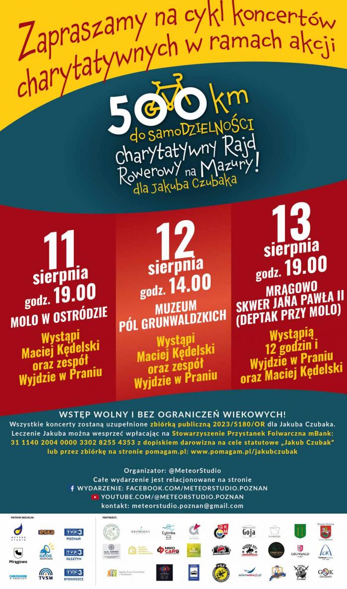 Teraz plan jest podobny. Od 8 sierpnia uczestnicy wyprawy jadą dla kolegi z Wielkopolski na Mazury. W ciągu podróży do Mrągowa, rowerową przejażdżkę urozmaicić mają koncerty. W niedzielę (11.08) w Ostródzie (molo) zaplanowany jest koncert Macieja Kędelskiego i zespołu Wyjdzie w Praniu. Ci sami wykonawcy pojawią się także w poniedziałek w muzeum na Polach Grunwaldzkich, a we wtorek na Skwerze Jana Pawła II w Mrągowie, gdzie na mecie rajdu "skład artystyczny" wzmocni lokalna grupa 12 Godzin. Szczegóły koncertów na plakacie.