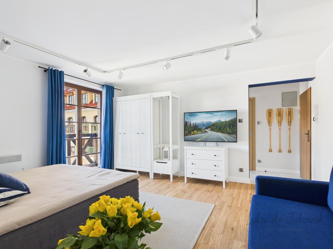 Mieszkanie ma świetną lokalizację - w niecałą minutę jesteśmy przy jeziorze Mikołajskim, Promenadzie i Porcie Mikołajki.